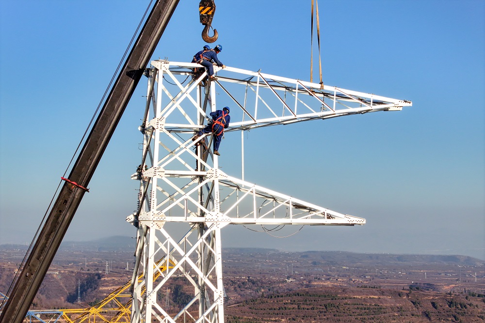 11月25日,國網(wǎng)運(yùn)城供電公司施工人員正在220千伏桃平線防覆冰改造工程現(xiàn)場組立鐵塔。